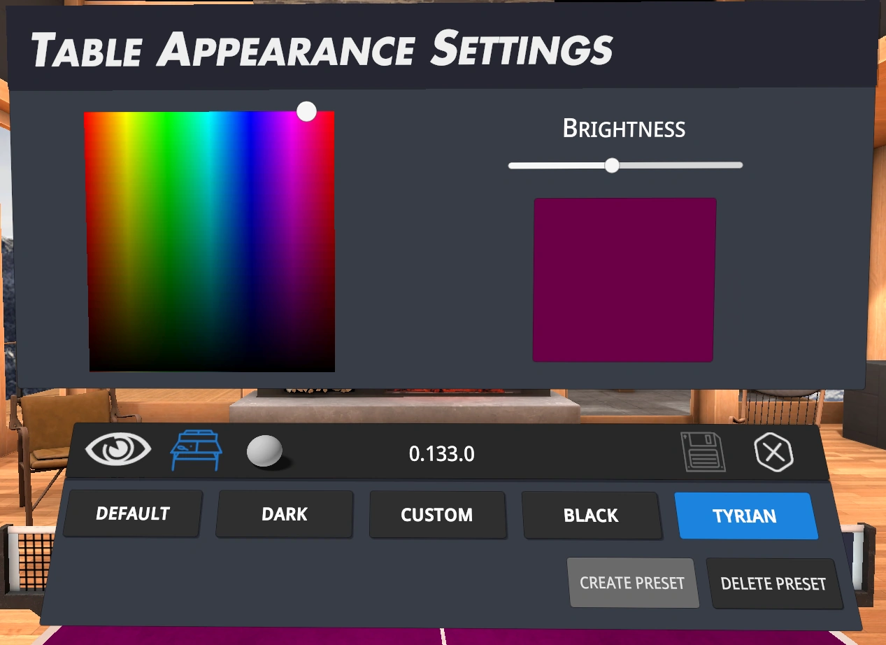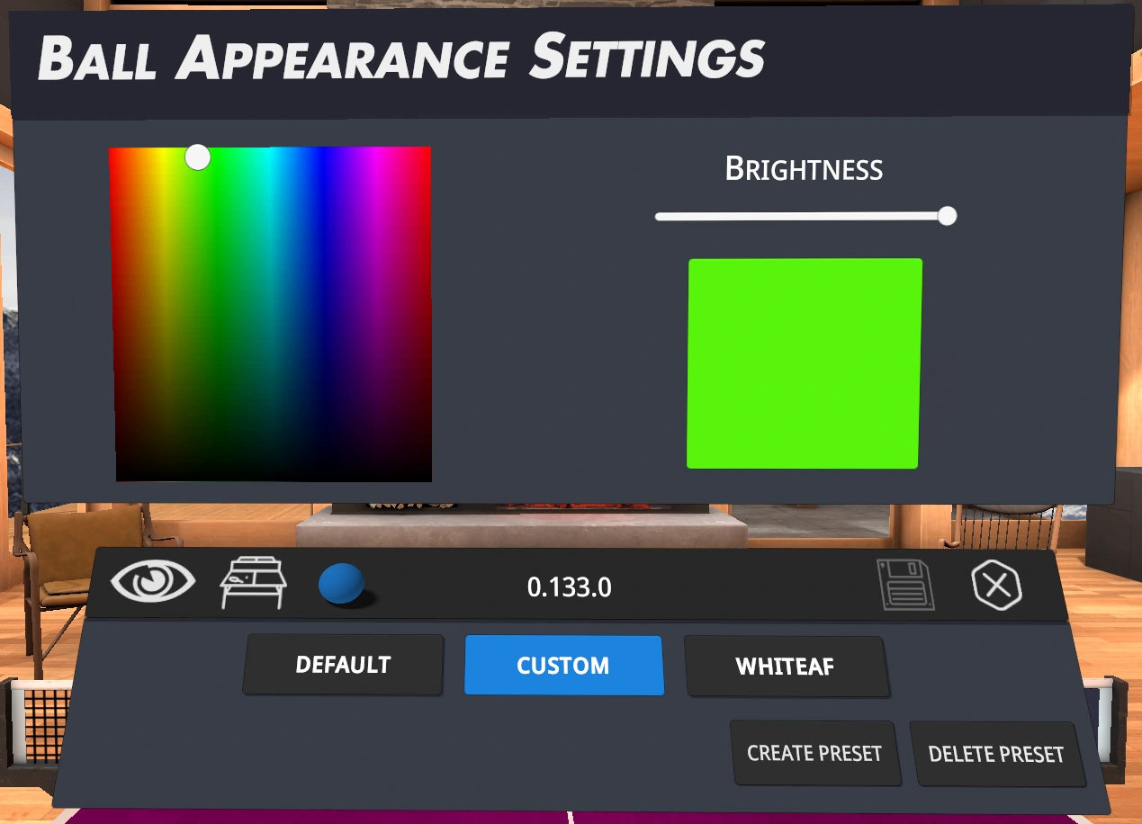 Located in Graphics Settings, the table and ball's colour can be changed and saved as presets. A popular combination is a dark or black table to best contrast an extremely visible bright green ball.